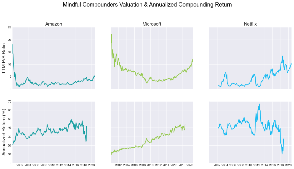 But how efficient has Mr. Market been in pricing the value of these companies really? Below I draw the time series of valuation (TTM P/S ratio), and annualized compounding return to date (i.e. if holding form that point of time to 9/30/2020). I excluded annualized return for recent 2 years since they are not representative for the short history.
